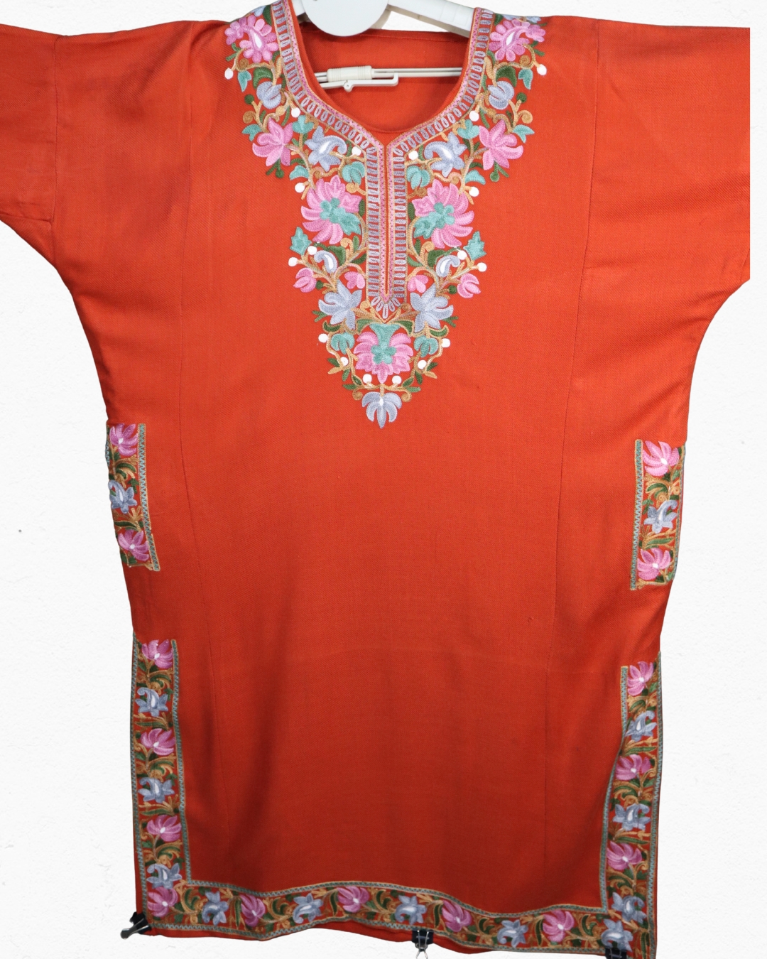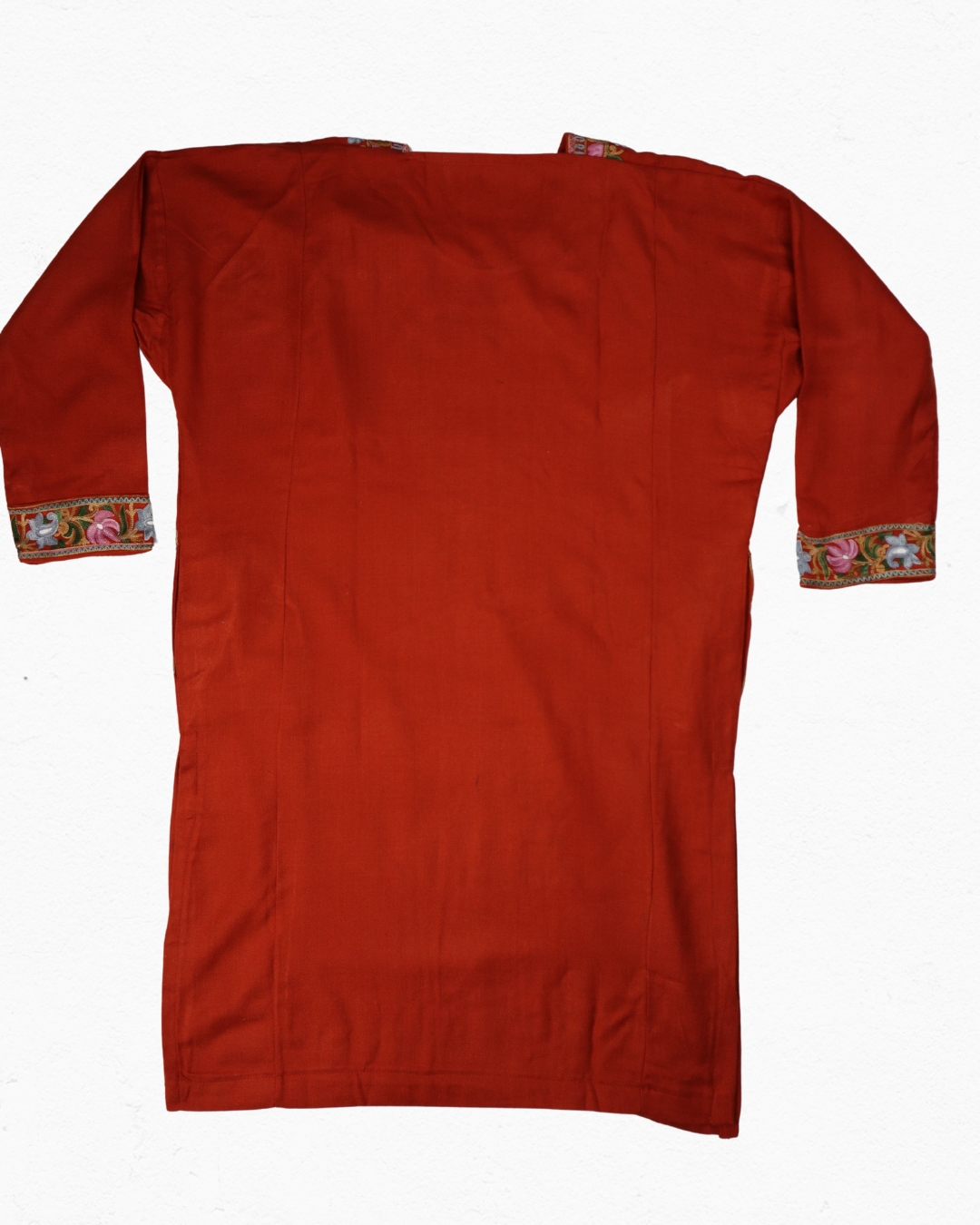 What sets it apart is the intricate embroidery along the neckline, sleeves (cuffs), side panels and hem — reminiscent of traditional Kashida embroidery. These floral and nature-inspired motifs are part of a centuries-old legacy of craftsmanship in Kashmir, blending Persian-influenced design sensibilities with the valley’s own aesthetic.