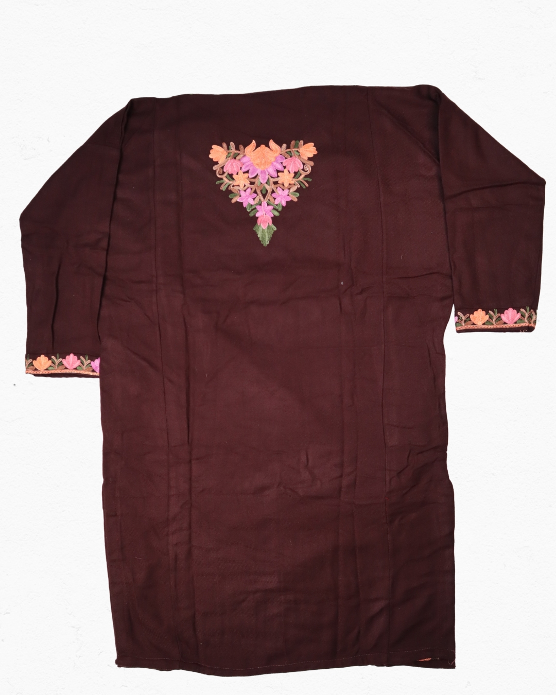 Colour: Deep maroon/brown base — elegant and versatile. The subdued hue makes the kurti suitable for both festive gatherings and everyday winter wear.