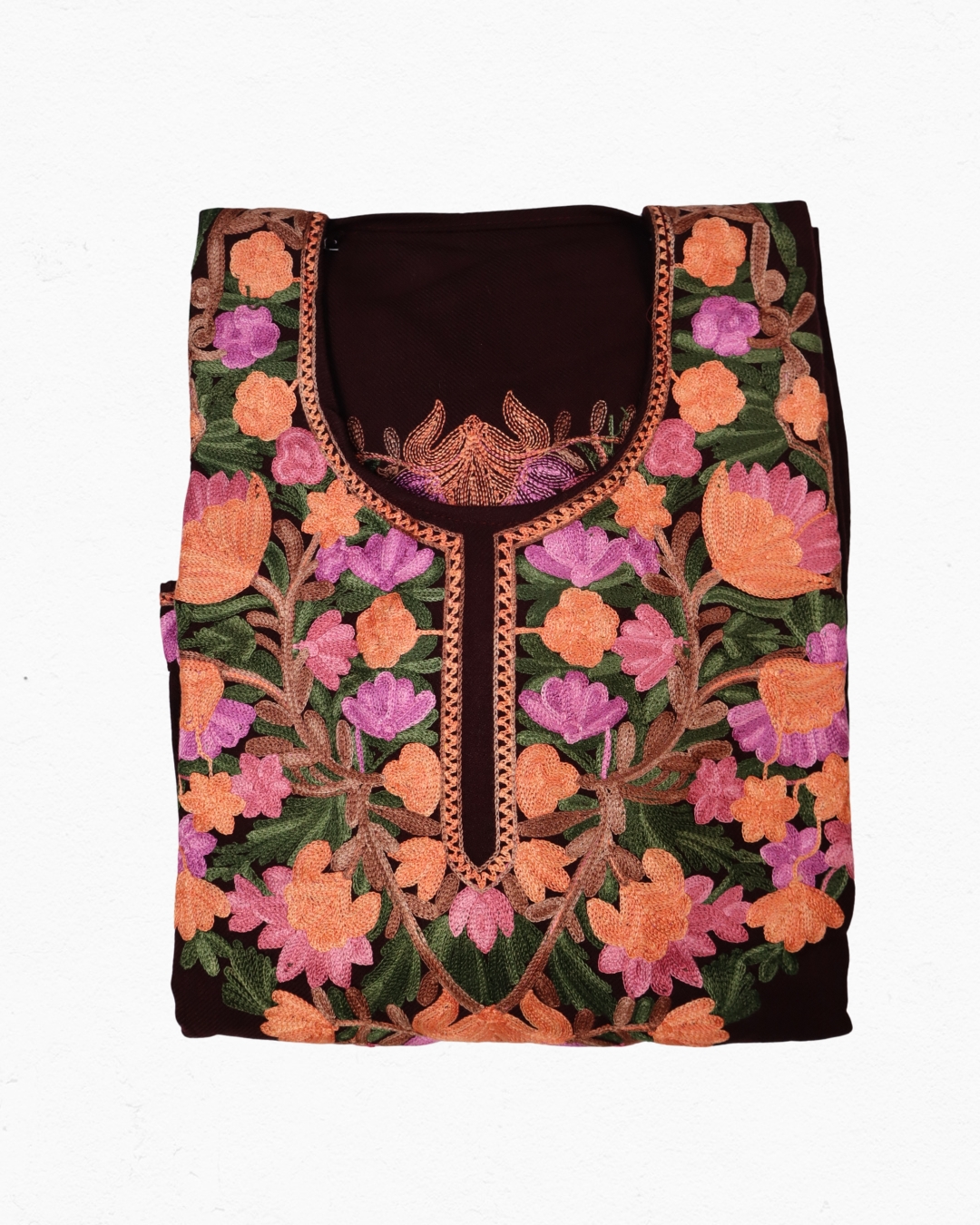 The embroidery on this kurti employs the traditional Kashida technique — an age-old embroidery art from Kashmir known for its nature-inspired motifs: flowers, leaves, vines and blossoms. Because Kashida work historically adorns shawls, phirans (traditional Kashmiri wool garments), and kurtas — you’re wearing more than fashion; you’re wearing a legacy.
